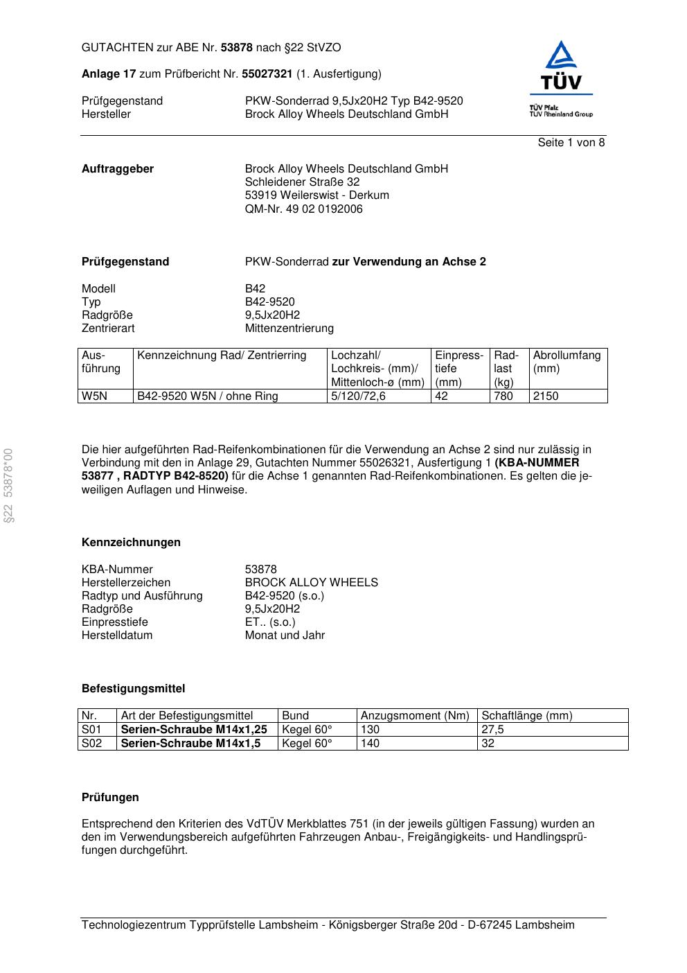 Dieses Gutachten (abe) bezieht sich auf die Alufelge Brock B42-9520 in der Ausführung 9.5Jx2 ET 0, Mittenloch 0 mm (KBA 53878). Im PDF findest du typischerweise zulässige Reifengrößen, Auflagen/Anbauhinweise und – je nach Dokument – Hinweise zur Eintragung.
