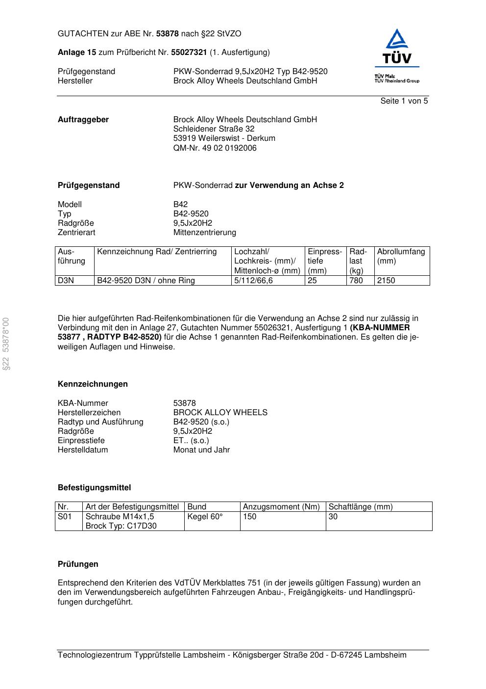 Dieses Gutachten (abe) bezieht sich auf die Alufelge Brock B42-9520 in der Ausführung 9.5Jx2 ET 0, Mittenloch 0 mm (KBA 53878). Im PDF findest du typischerweise zulässige Reifengrößen, Auflagen/Anbauhinweise und – je nach Dokument – Hinweise zur Eintragung.