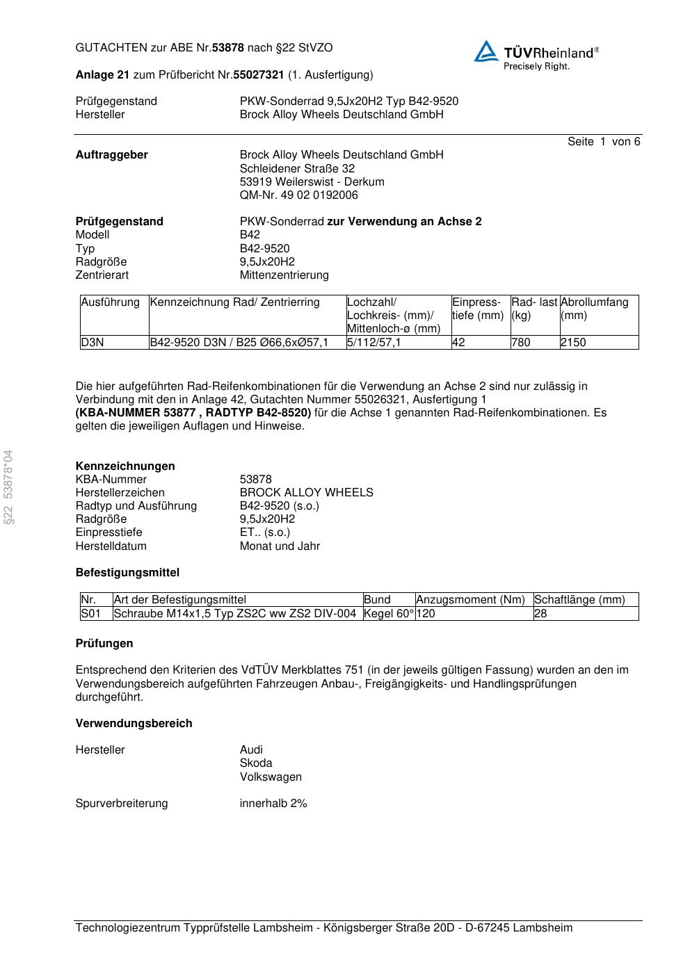 Dieses Gutachten (abe) bezieht sich auf die Alufelge Brock B42-9520 in der Ausführung 9.5Jx2 ET 0, Mittenloch 0 mm (KBA 53878). Im PDF findest du typischerweise zulässige Reifengrößen, Auflagen/Anbauhinweise und – je nach Dokument – Hinweise zur Eintragung.