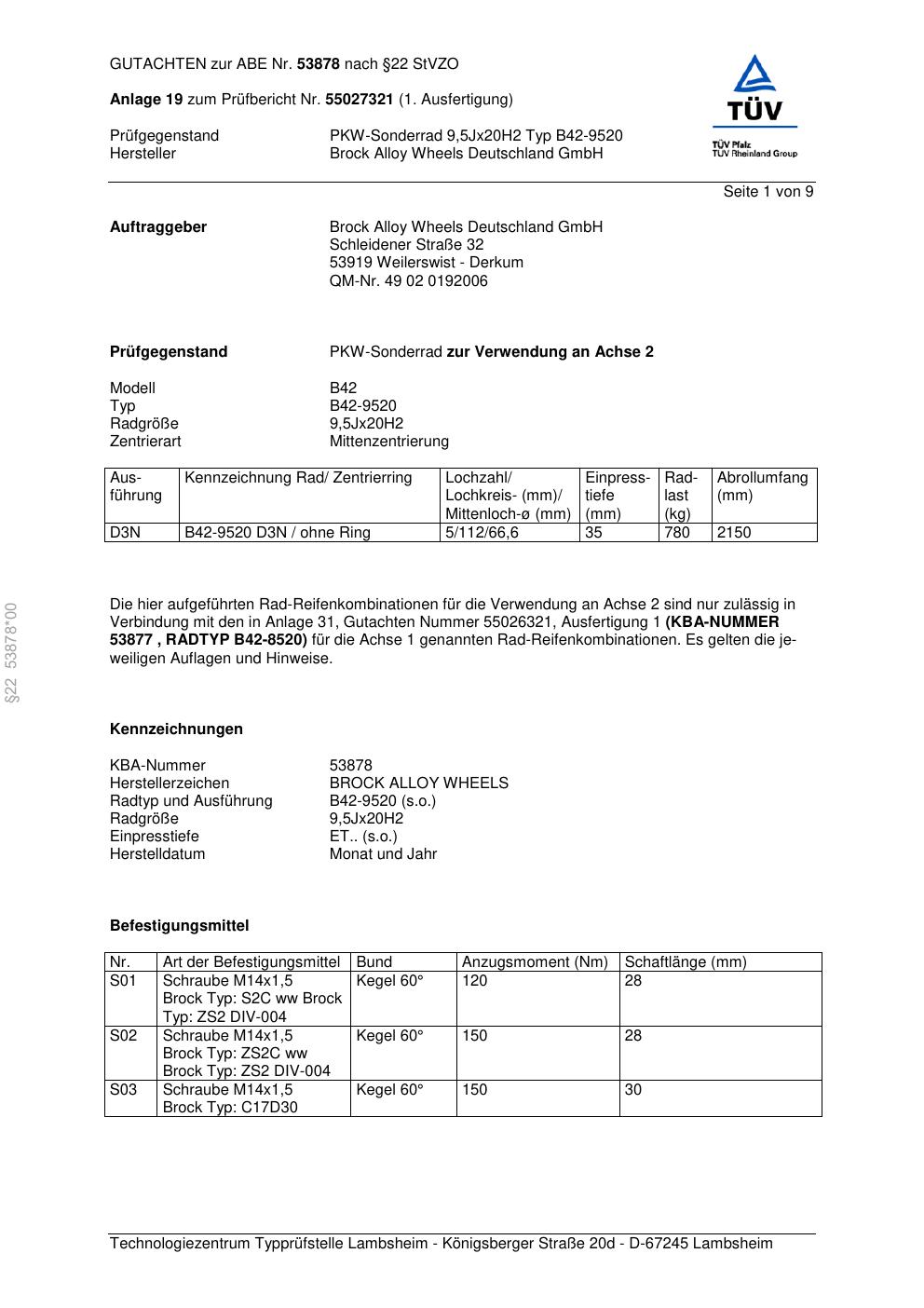 Dieses Gutachten (abe) bezieht sich auf die Alufelge Brock B42-9520 in der Ausführung 9.5Jx2 ET 0, Mittenloch 0 mm (KBA 53878). Im PDF findest du typischerweise zulässige Reifengrößen, Auflagen/Anbauhinweise und – je nach Dokument – Hinweise zur Eintragung.