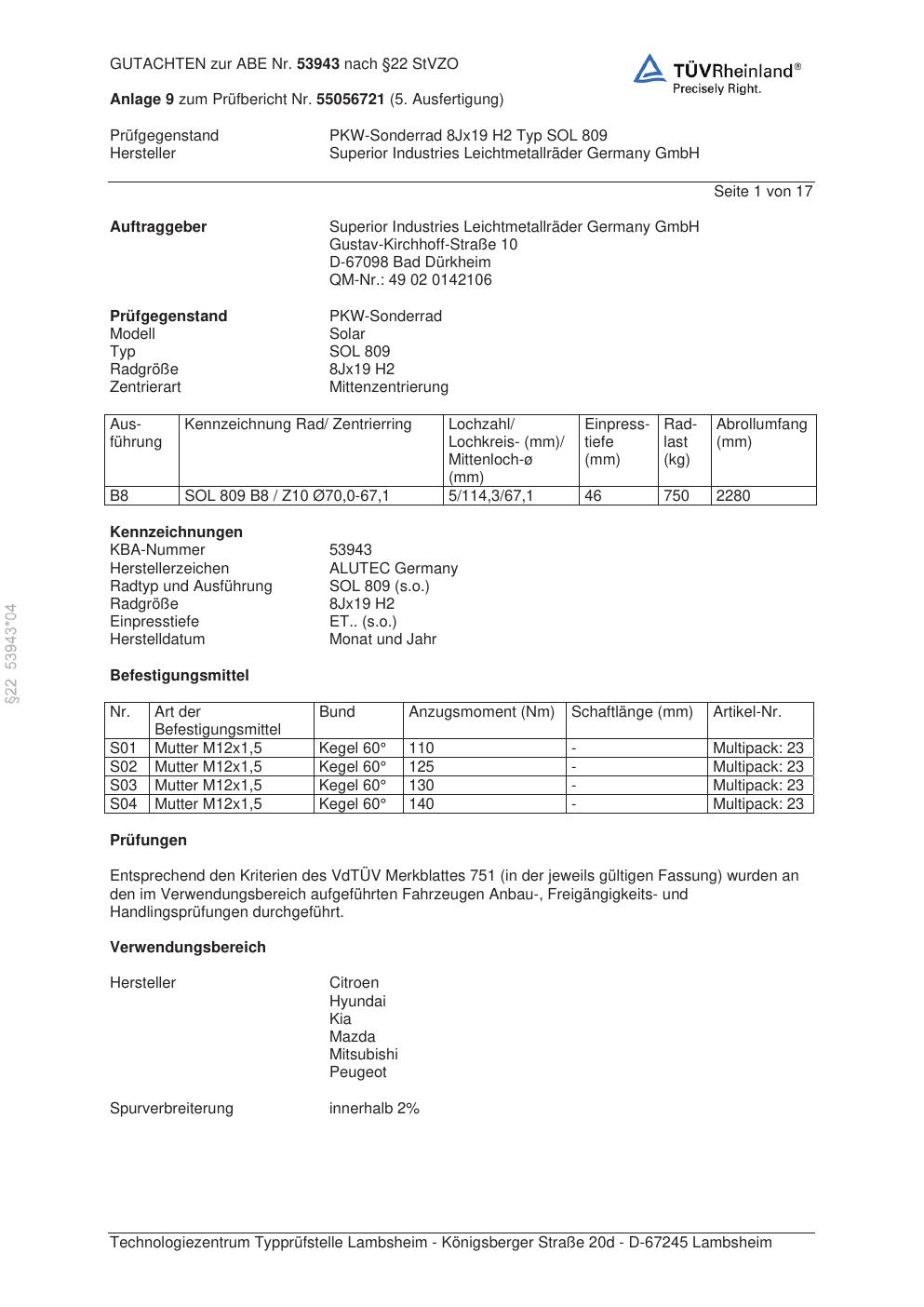 Dieses Gutachten (abe) bezieht sich auf die Alufelge ALUTEC SOL 809 in der Ausführung 8Jx19 ET 0, Mittenloch 0 mm (KBA 53943). Im PDF findest du typischerweise zulässige Reifengrößen, Auflagen/Anbauhinweise und – je nach Dokument – Hinweise zur Eintragung.