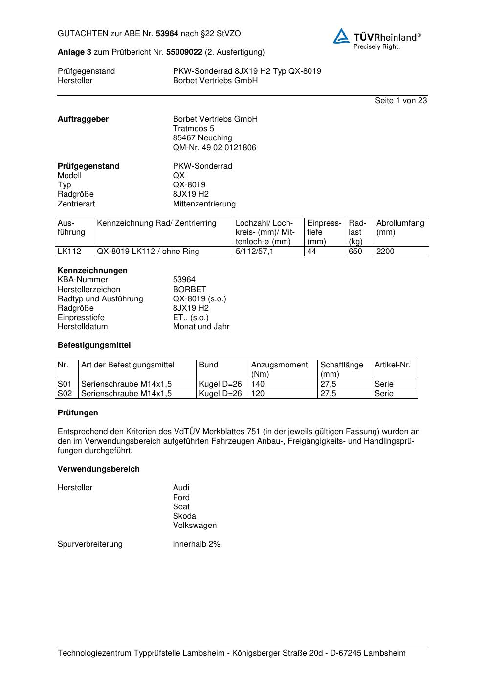 Dieses Gutachten (abe) bezieht sich auf die Alufelge Borbet QX-8019 in der Ausführung 8Jx19 ET 0, Mittenloch 0 mm (KBA 53964). Im PDF findest du typischerweise zulässige Reifengrößen, Auflagen/Anbauhinweise und – je nach Dokument – Hinweise zur Eintragung.