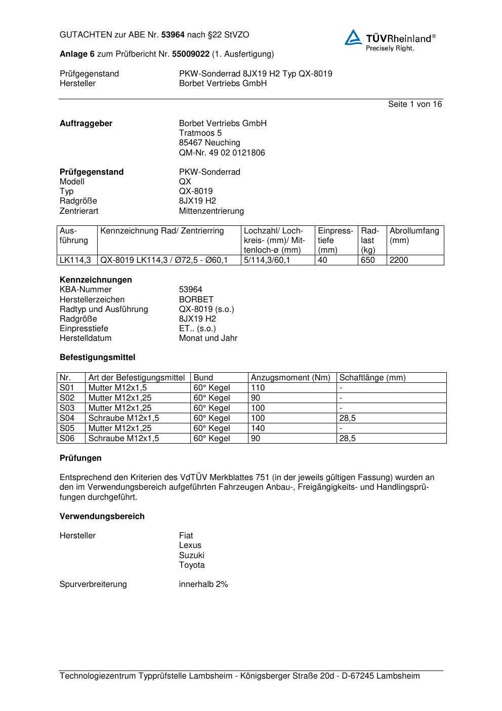 Dieses Gutachten (abe) bezieht sich auf die Alufelge Borbet QX-8019 in der Ausführung 8Jx19 ET 0, Mittenloch 0 mm (KBA 53964). Im PDF findest du typischerweise zulässige Reifengrößen, Auflagen/Anbauhinweise und – je nach Dokument – Hinweise zur Eintragung.