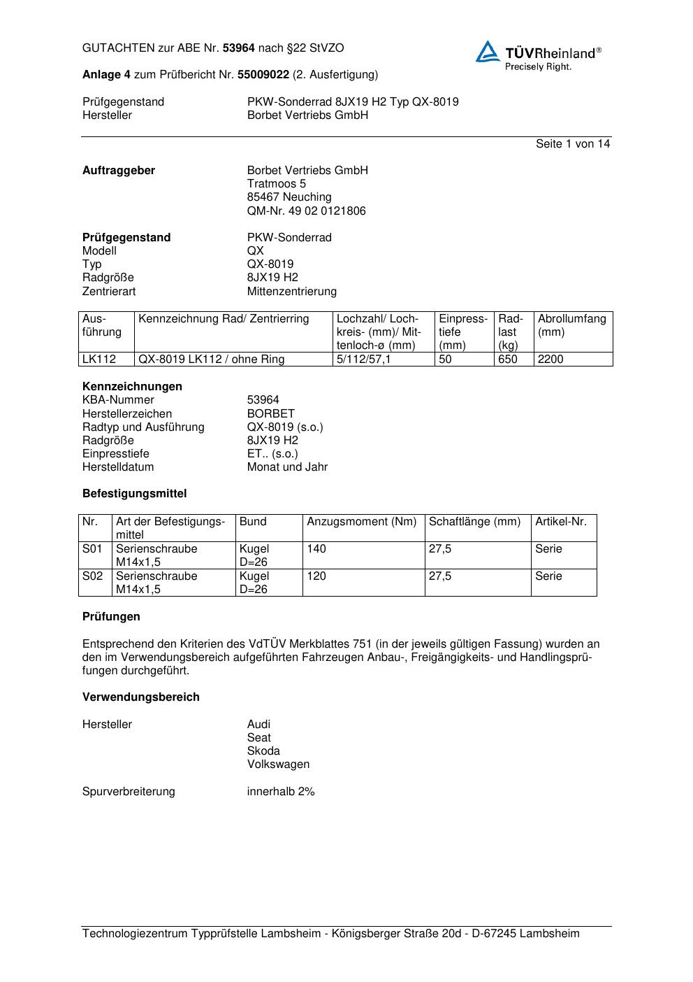 Dieses Gutachten (abe) bezieht sich auf die Alufelge Borbet QX-8019 in der Ausführung 8Jx19 ET 0, Mittenloch 0 mm (KBA 53964). Im PDF findest du typischerweise zulässige Reifengrößen, Auflagen/Anbauhinweise und – je nach Dokument – Hinweise zur Eintragung.