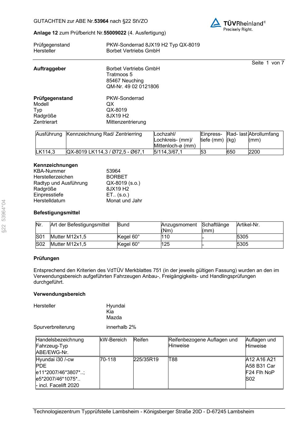 Dieses Gutachten (abe) bezieht sich auf die Alufelge Borbet QX-8019 in der Ausführung 8Jx19 ET 0, Mittenloch 0 mm (KBA 53964). Im PDF findest du typischerweise zulässige Reifengrößen, Auflagen/Anbauhinweise und – je nach Dokument – Hinweise zur Eintragung.