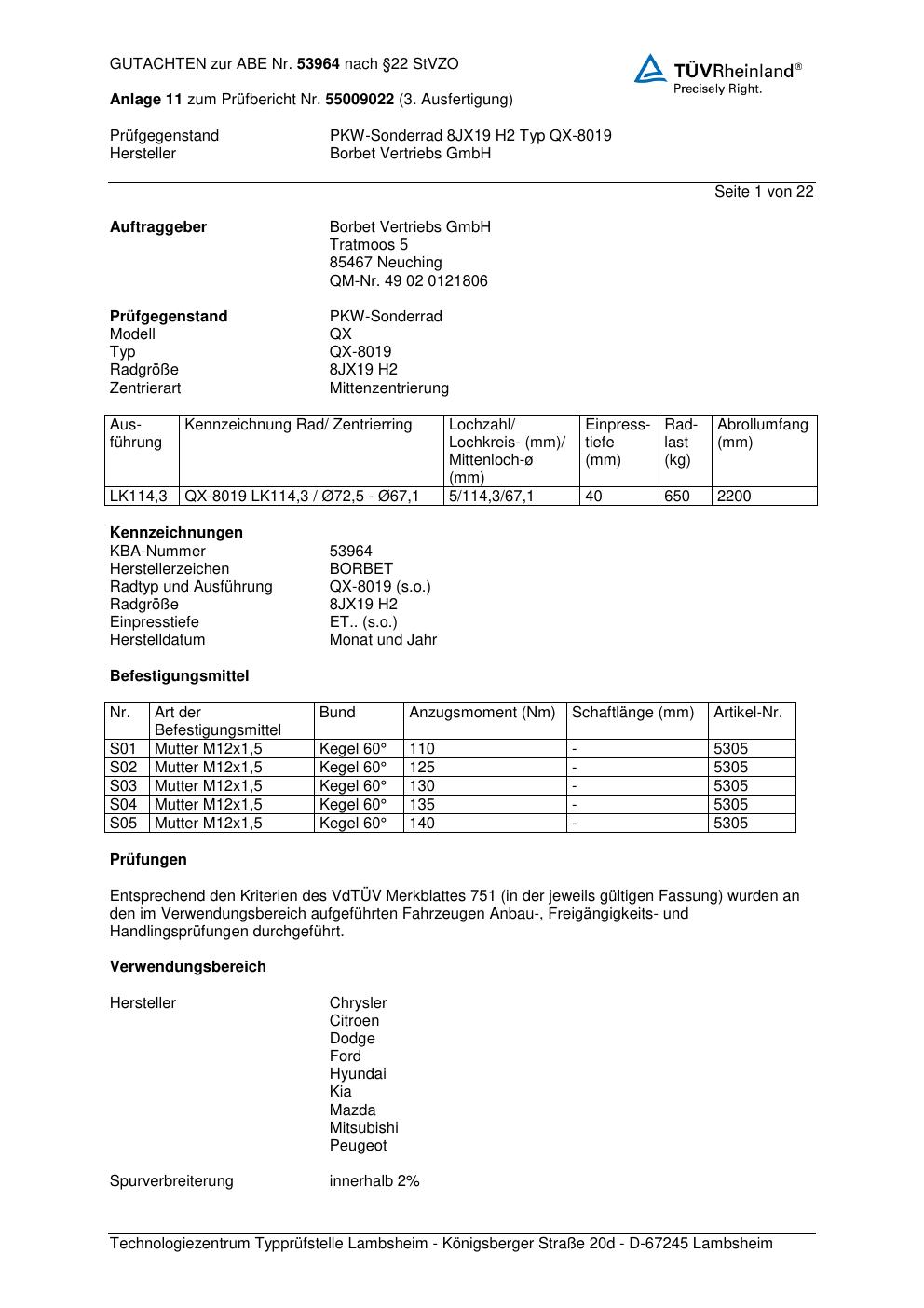 Dieses Gutachten (abe) bezieht sich auf die Alufelge Borbet QX-8019 in der Ausführung 8Jx19 ET 0, Mittenloch 0 mm (KBA 53964). Im PDF findest du typischerweise zulässige Reifengrößen, Auflagen/Anbauhinweise und – je nach Dokument – Hinweise zur Eintragung.