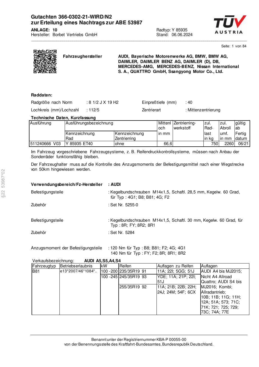 Dieses Gutachten (abe) bezieht sich auf die Alufelge Borbet Y 85935 in der Ausführung 2Jx19 ET 0, Mittenloch 0 mm (KBA 53987). Im PDF findest du typischerweise zulässige Reifengrößen, Auflagen/Anbauhinweise und – je nach Dokument – Hinweise zur Eintragung.