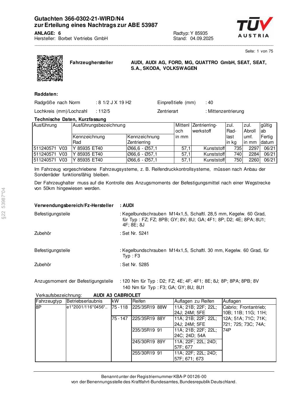 Dieses Gutachten (abe) bezieht sich auf die Alufelge Borbet Y 85935 in der Ausführung 2Jx19 ET 0, Mittenloch 0 mm (KBA 53987). Im PDF findest du typischerweise zulässige Reifengrößen, Auflagen/Anbauhinweise und – je nach Dokument – Hinweise zur Eintragung.