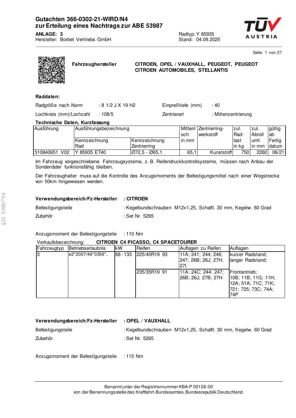 Dieses Gutachten (abe) bezieht sich auf die Alufelge Borbet Y 85935 in der Ausführung 2Jx19 ET 0, Mittenloch 0 mm (KBA 53987). Im PDF findest du typischerweise zulässige Reifengrößen, Auflagen/Anbauhinweise und – je nach Dokument – Hinweise zur Eintragung.