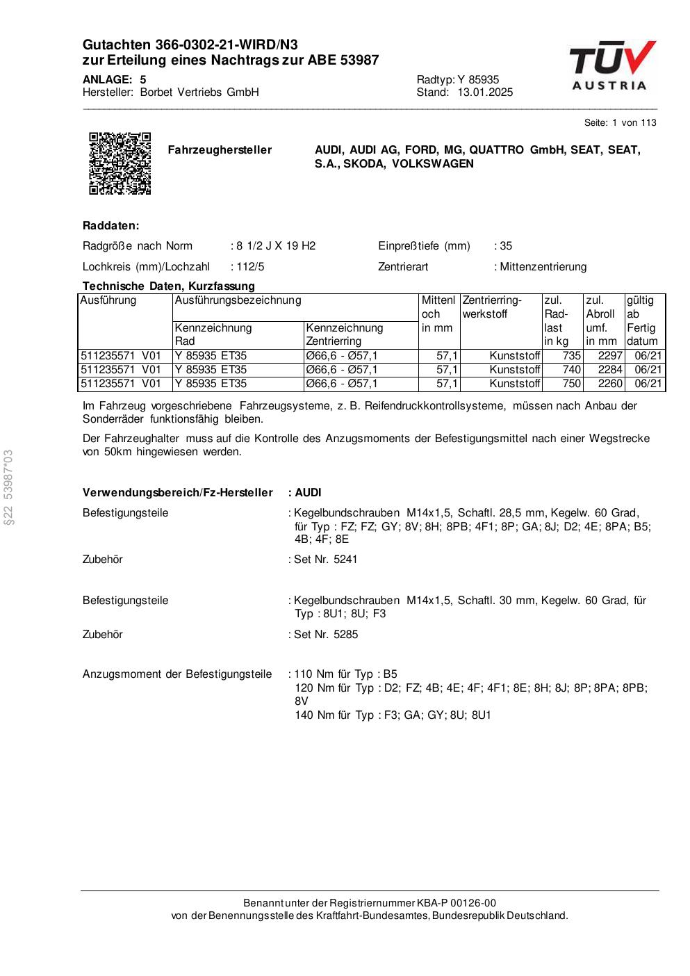 Dieses Gutachten (abe) bezieht sich auf die Alufelge Borbet Y 85935 in der Ausführung 2Jx19 ET 0, Mittenloch 0 mm (KBA 53987). Im PDF findest du typischerweise zulässige Reifengrößen, Auflagen/Anbauhinweise und – je nach Dokument – Hinweise zur Eintragung.