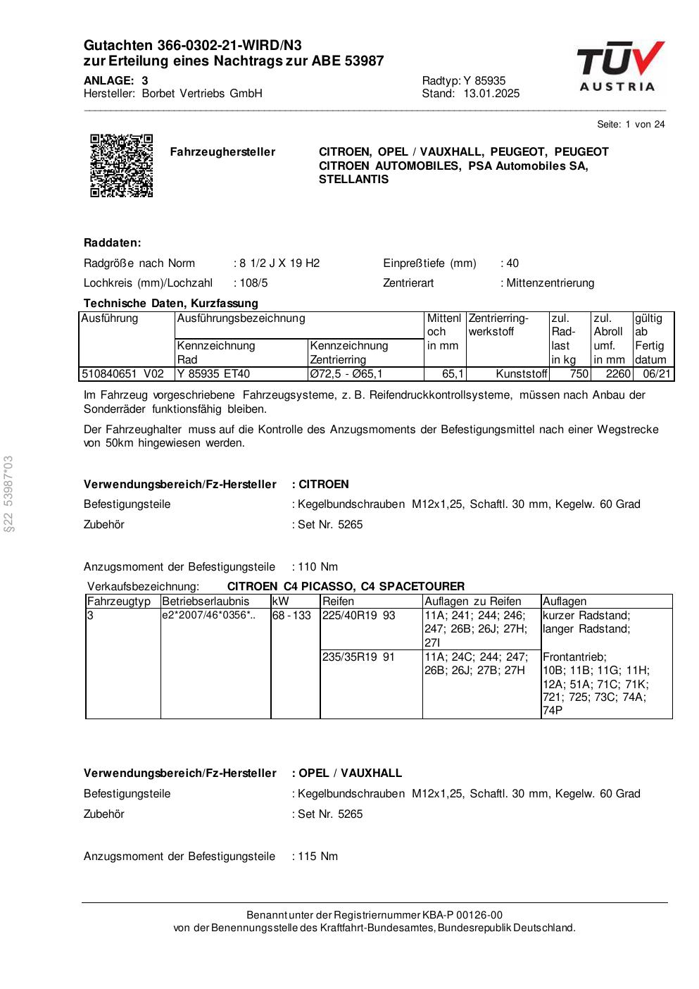 Dieses Gutachten (abe) bezieht sich auf die Alufelge Borbet Y 85935 in der Ausführung 2Jx19 ET 0, Mittenloch 0 mm (KBA 53987). Im PDF findest du typischerweise zulässige Reifengrößen, Auflagen/Anbauhinweise und – je nach Dokument – Hinweise zur Eintragung.