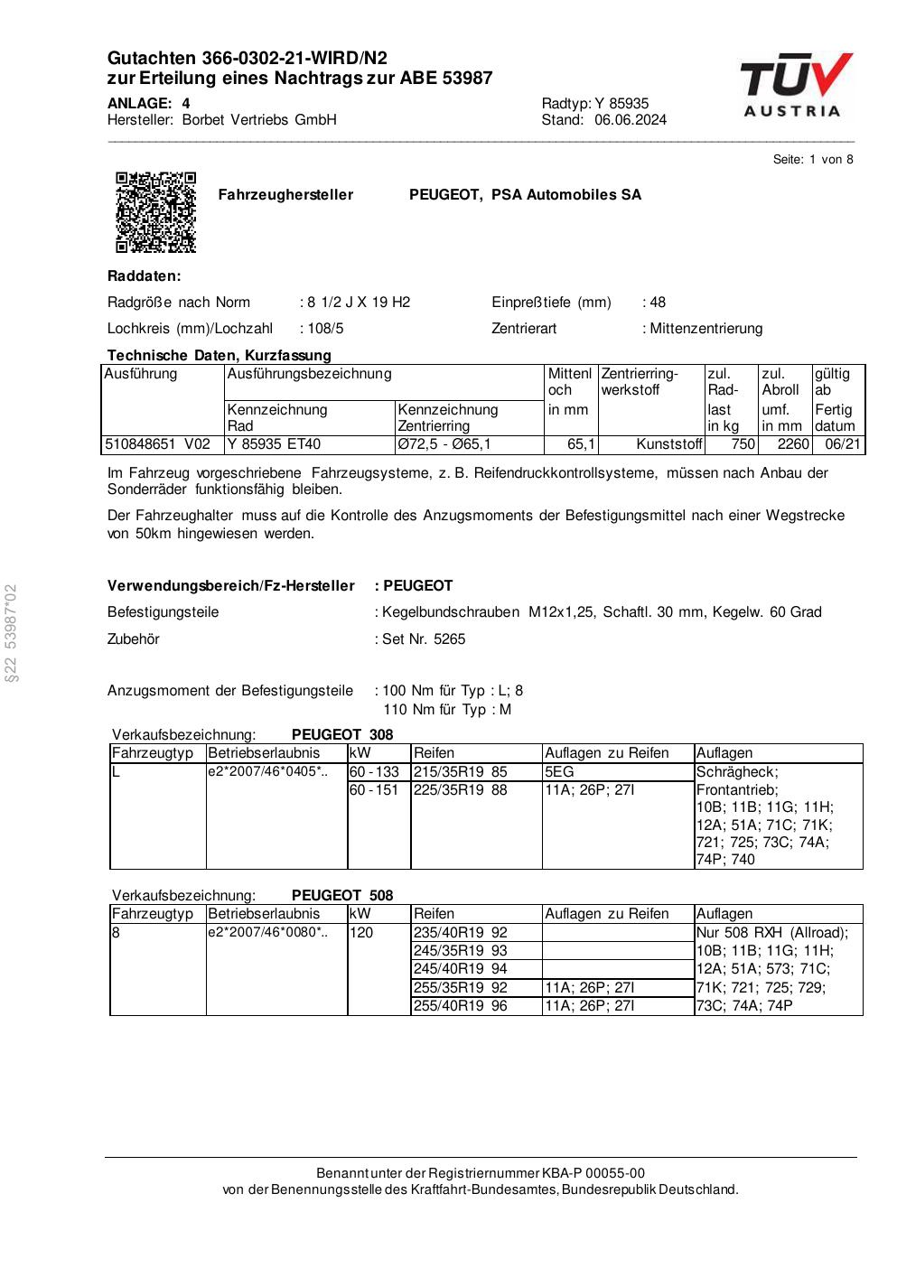 Dieses Gutachten (abe) bezieht sich auf die Alufelge Borbet Y 85935 in der Ausführung 2Jx19 ET 0, Mittenloch 0 mm (KBA 53987). Im PDF findest du typischerweise zulässige Reifengrößen, Auflagen/Anbauhinweise und – je nach Dokument – Hinweise zur Eintragung.