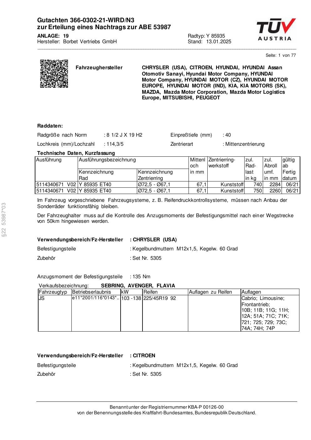 Dieses Gutachten (abe) bezieht sich auf die Alufelge Borbet Y 85935 in der Ausführung 2Jx19 ET 0, Mittenloch 0 mm (KBA 53987). Im PDF findest du typischerweise zulässige Reifengrößen, Auflagen/Anbauhinweise und – je nach Dokument – Hinweise zur Eintragung.