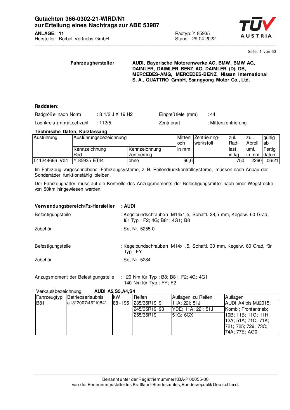 Dieses Gutachten (abe) bezieht sich auf die Alufelge Borbet Y 85935 in der Ausführung 2Jx19 ET 0, Mittenloch 0 mm (KBA 53987). Im PDF findest du typischerweise zulässige Reifengrößen, Auflagen/Anbauhinweise und – je nach Dokument – Hinweise zur Eintragung.