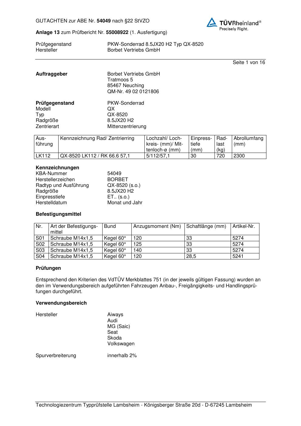 Felgengutachten / abe für Alufelgen Borbet QX-8520 (8.5Jx2 ET 0, Mittenloch 0 mm) mit KBA 54049 (Zertifikatsnummer 54049). Hier kostenlos als PDF herunterladen. Der Download-Link ist 24 Stunden gültig und kann bis zu zwei Mal verwendet werden.