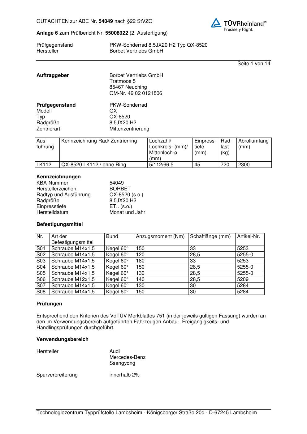Dieses Gutachten (abe) bezieht sich auf die Alufelge Borbet QX-8520 in der Ausführung 8.5Jx2 ET 0, Mittenloch 0 mm (KBA 54049). Im PDF findest du typischerweise zulässige Reifengrößen, Auflagen/Anbauhinweise und – je nach Dokument – Hinweise zur Eintragung.