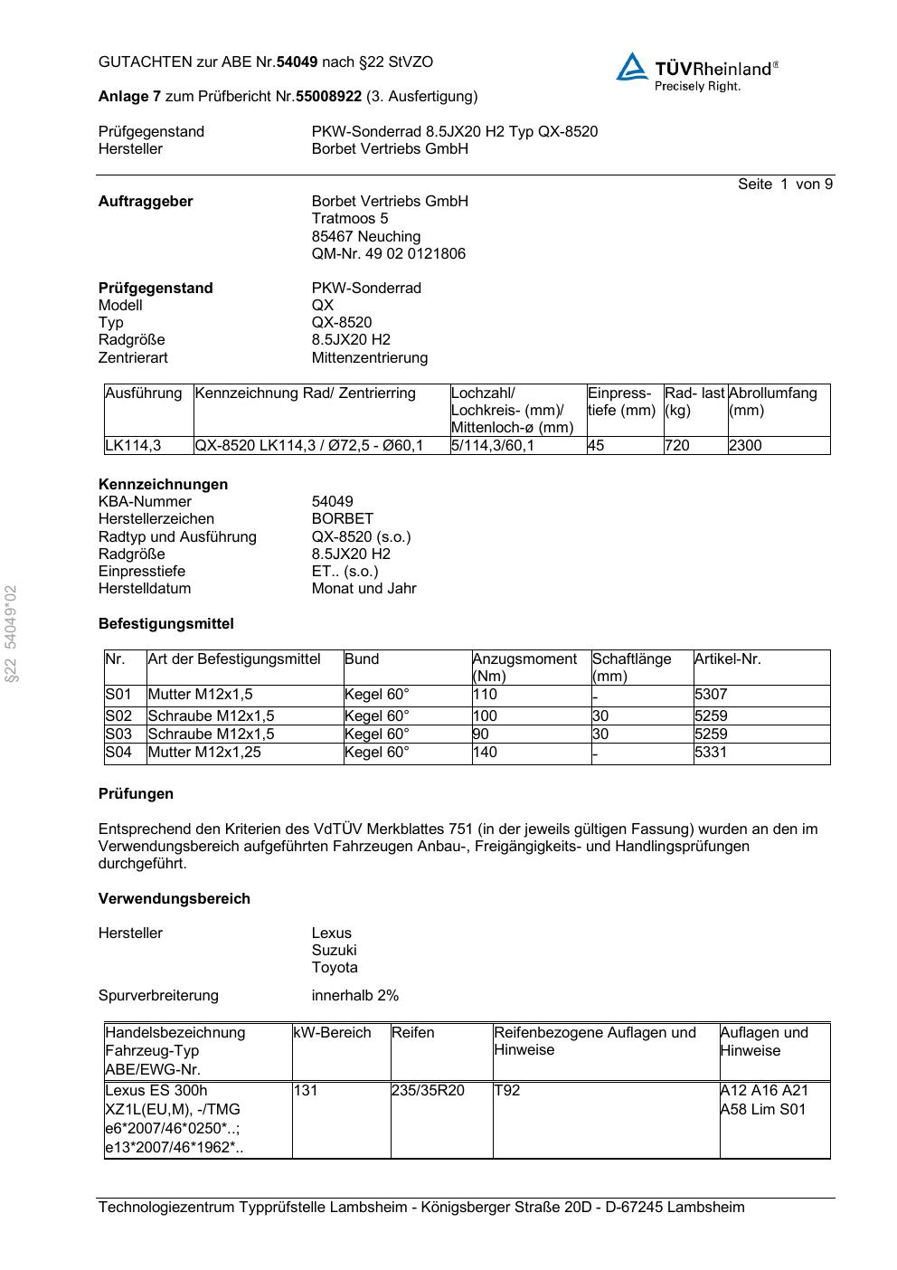 Dieses Gutachten (abe) bezieht sich auf die Alufelge Borbet QX-8520 in der Ausführung 8.5Jx2 ET 0, Mittenloch 0 mm (KBA 54049). Im PDF findest du typischerweise zulässige Reifengrößen, Auflagen/Anbauhinweise und – je nach Dokument – Hinweise zur Eintragung.
