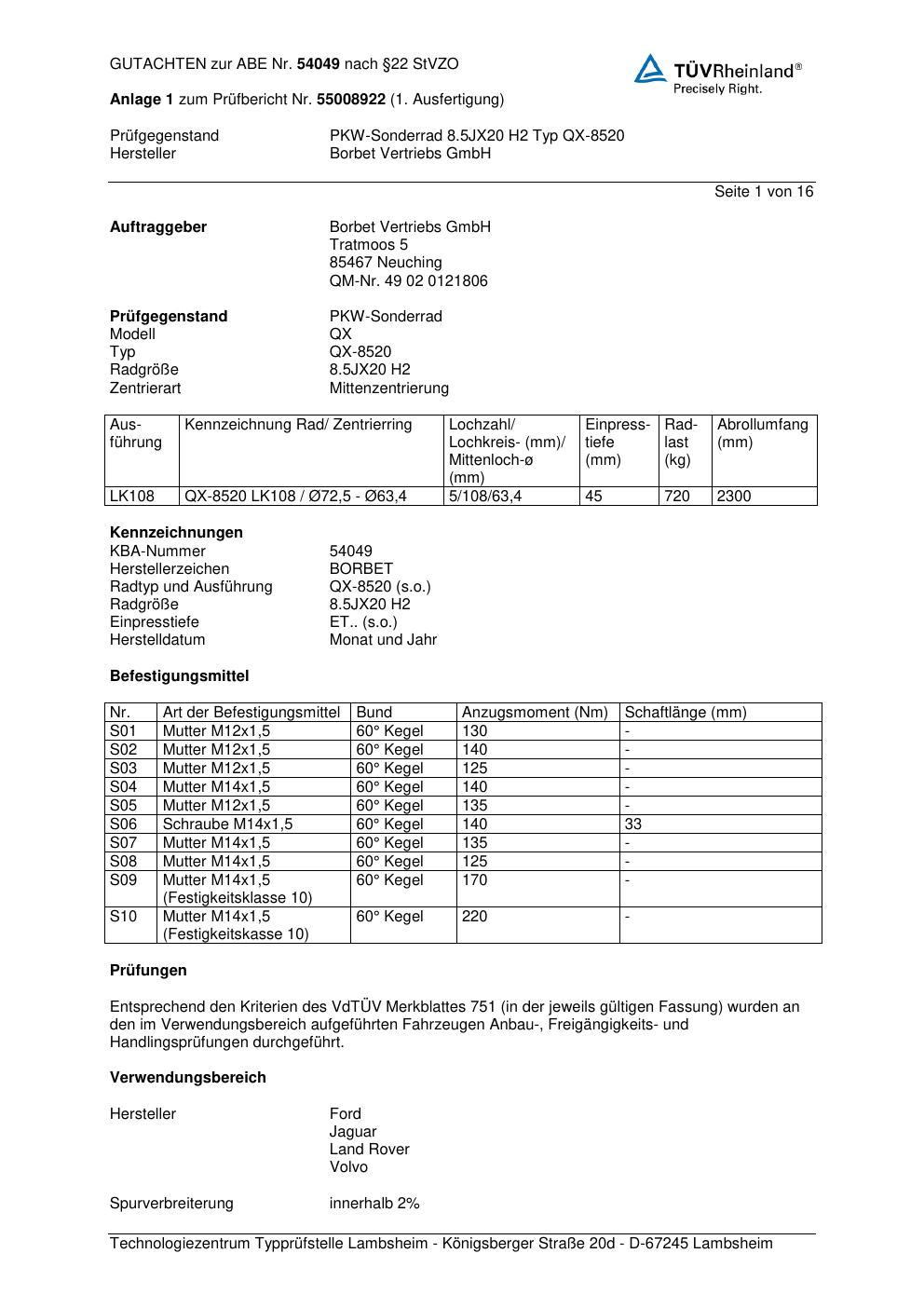 Dieses Gutachten (abe) bezieht sich auf die Alufelge Borbet QX-8520 in der Ausführung 8.5Jx2 ET 0, Mittenloch 0 mm (KBA 54049). Im PDF findest du typischerweise zulässige Reifengrößen, Auflagen/Anbauhinweise und – je nach Dokument – Hinweise zur Eintragung.