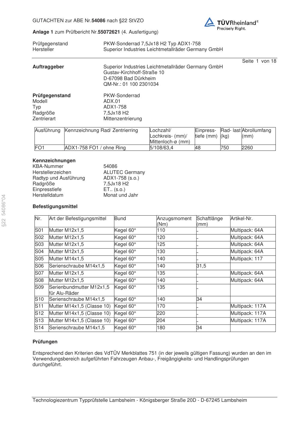 Dieses Gutachten (abe) bezieht sich auf die Alufelge ALUTEC ADX1-758 in der Ausführung 7.5Jx18 ET 0, Mittenloch 0 mm (KBA 54086). Im PDF findest du typischerweise zulässige Reifengrößen, Auflagen/Anbauhinweise und – je nach Dokument – Hinweise zur Eintragung.