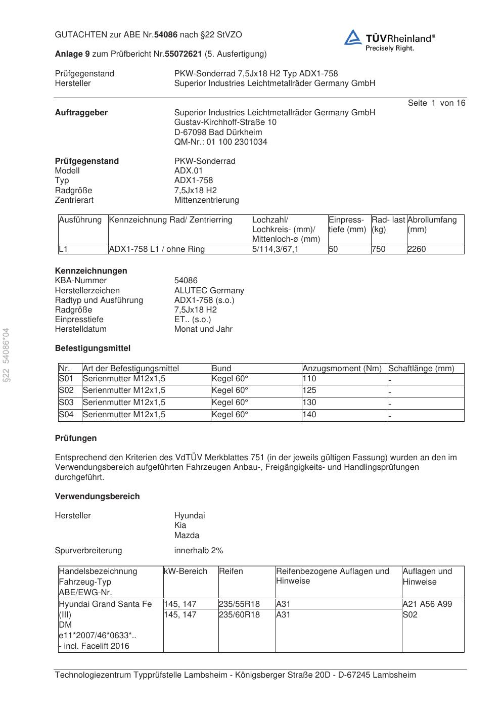 Dieses Gutachten (abe) bezieht sich auf die Alufelge ALUTEC ADX1-758 in der Ausführung 7.5Jx18 ET 0, Mittenloch 0 mm (KBA 54086). Im PDF findest du typischerweise zulässige Reifengrößen, Auflagen/Anbauhinweise und – je nach Dokument – Hinweise zur Eintragung.