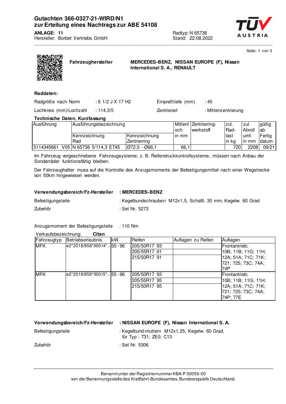 Dieses Gutachten (abe) bezieht sich auf die Alufelge Borbet N 65738 in der Ausführung 2Jx17 ET 0, Mittenloch 0 mm (KBA 54108). Im PDF findest du typischerweise zulässige Reifengrößen, Auflagen/Anbauhinweise und – je nach Dokument – Hinweise zur Eintragung.