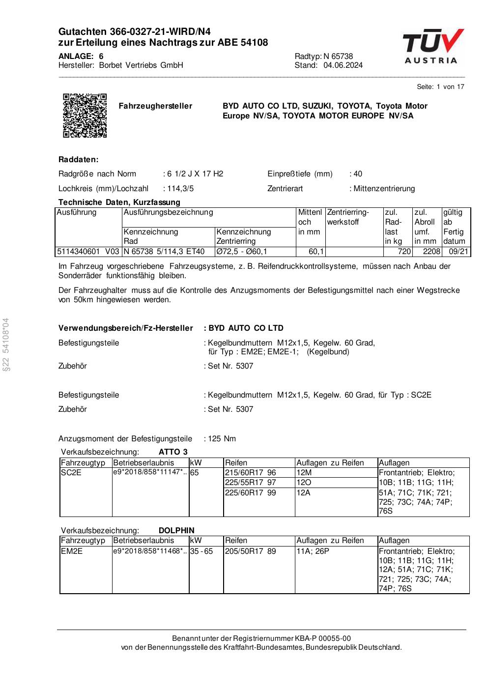 Dieses Gutachten (abe) bezieht sich auf die Alufelge Borbet N 65738 in der Ausführung 2Jx17 ET 0, Mittenloch 0 mm (KBA 54108). Im PDF findest du typischerweise zulässige Reifengrößen, Auflagen/Anbauhinweise und – je nach Dokument – Hinweise zur Eintragung.