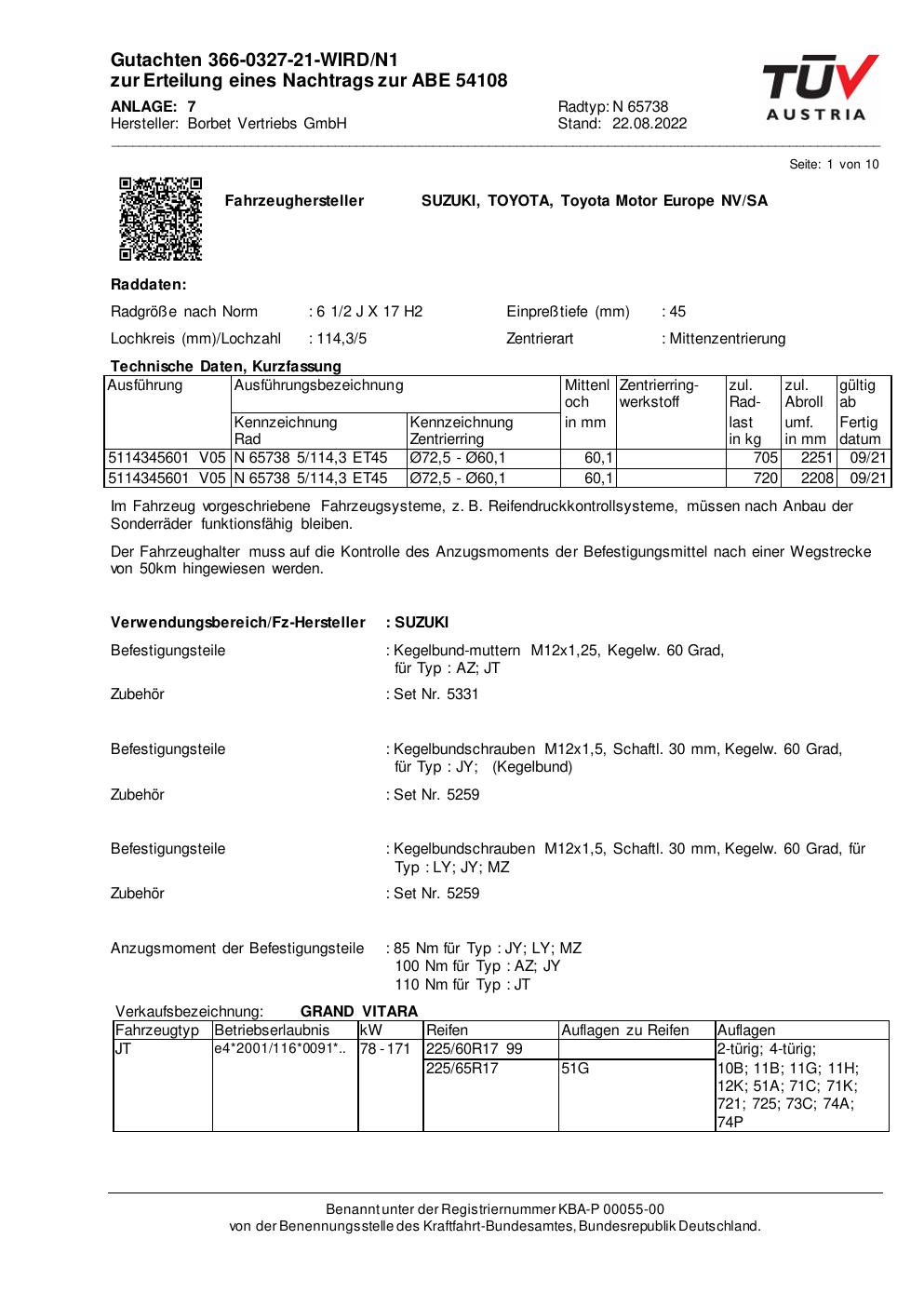 Dieses Gutachten (abe) bezieht sich auf die Alufelge Borbet N 65738 in der Ausführung 2Jx17 ET 0, Mittenloch 0 mm (KBA 54108). Im PDF findest du typischerweise zulässige Reifengrößen, Auflagen/Anbauhinweise und – je nach Dokument – Hinweise zur Eintragung.