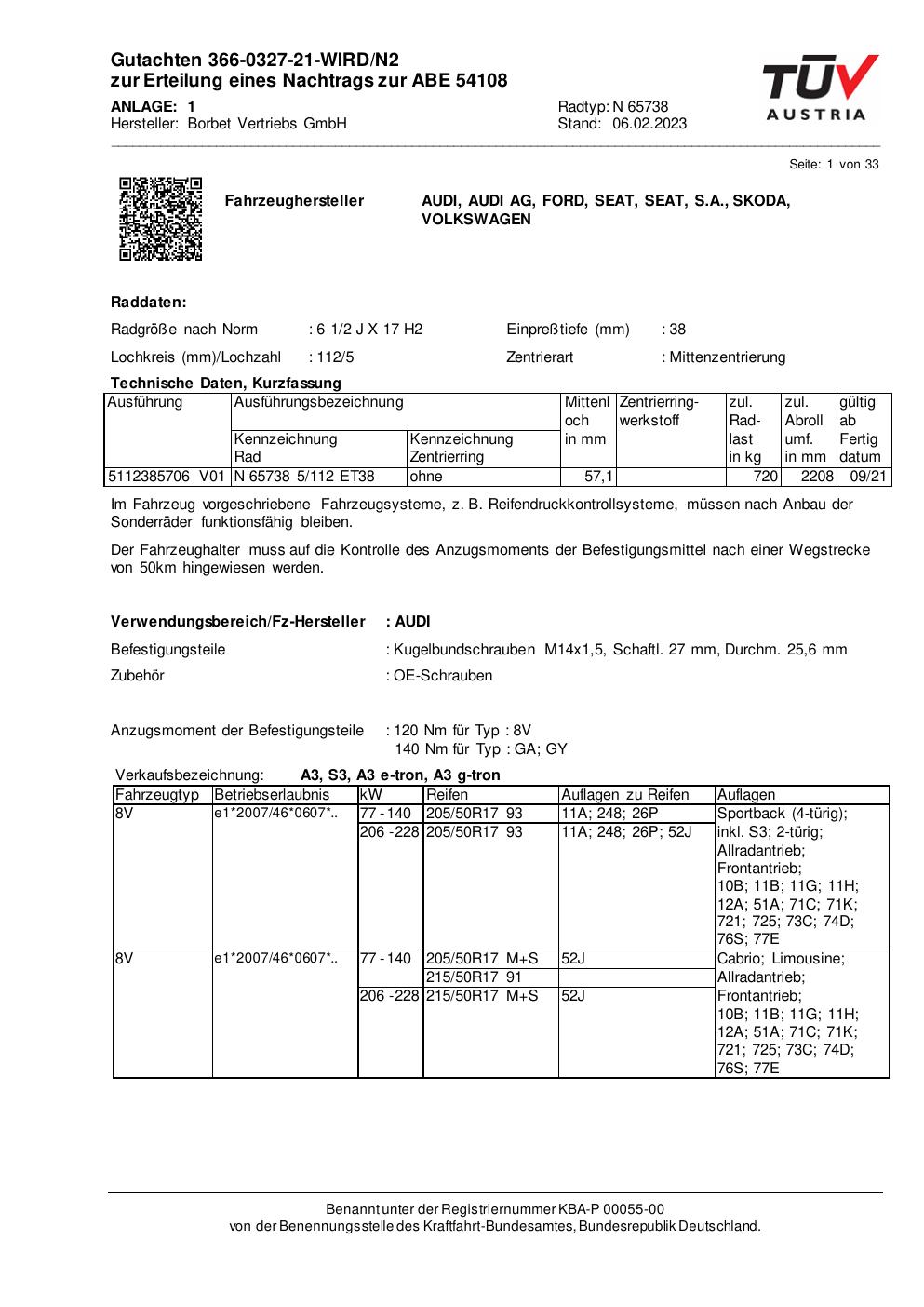 Dieses Gutachten (abe) bezieht sich auf die Alufelge Borbet N 65738 in der Ausführung 2Jx17 ET 0, Mittenloch 0 mm (KBA 54108). Im PDF findest du typischerweise zulässige Reifengrößen, Auflagen/Anbauhinweise und – je nach Dokument – Hinweise zur Eintragung.