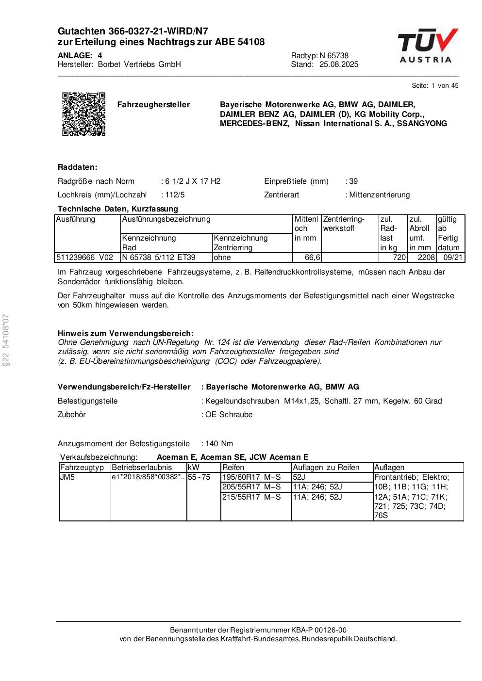 Dieses Gutachten (abe) bezieht sich auf die Alufelge Borbet N 65738 in der Ausführung 2Jx17 ET 0, Mittenloch 0 mm (KBA 54108). Im PDF findest du typischerweise zulässige Reifengrößen, Auflagen/Anbauhinweise und – je nach Dokument – Hinweise zur Eintragung.
