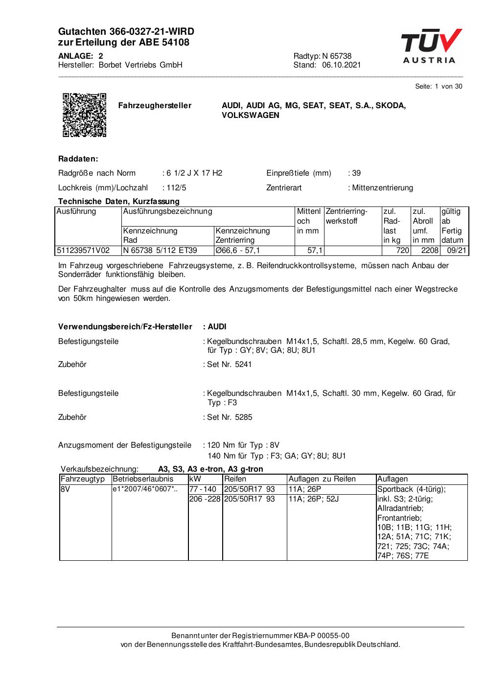 Dieses Gutachten (abe) bezieht sich auf die Alufelge Borbet N 65738 in der Ausführung 2Jx17 ET 0, Mittenloch 0 mm (KBA 54108). Im PDF findest du typischerweise zulässige Reifengrößen, Auflagen/Anbauhinweise und – je nach Dokument – Hinweise zur Eintragung.