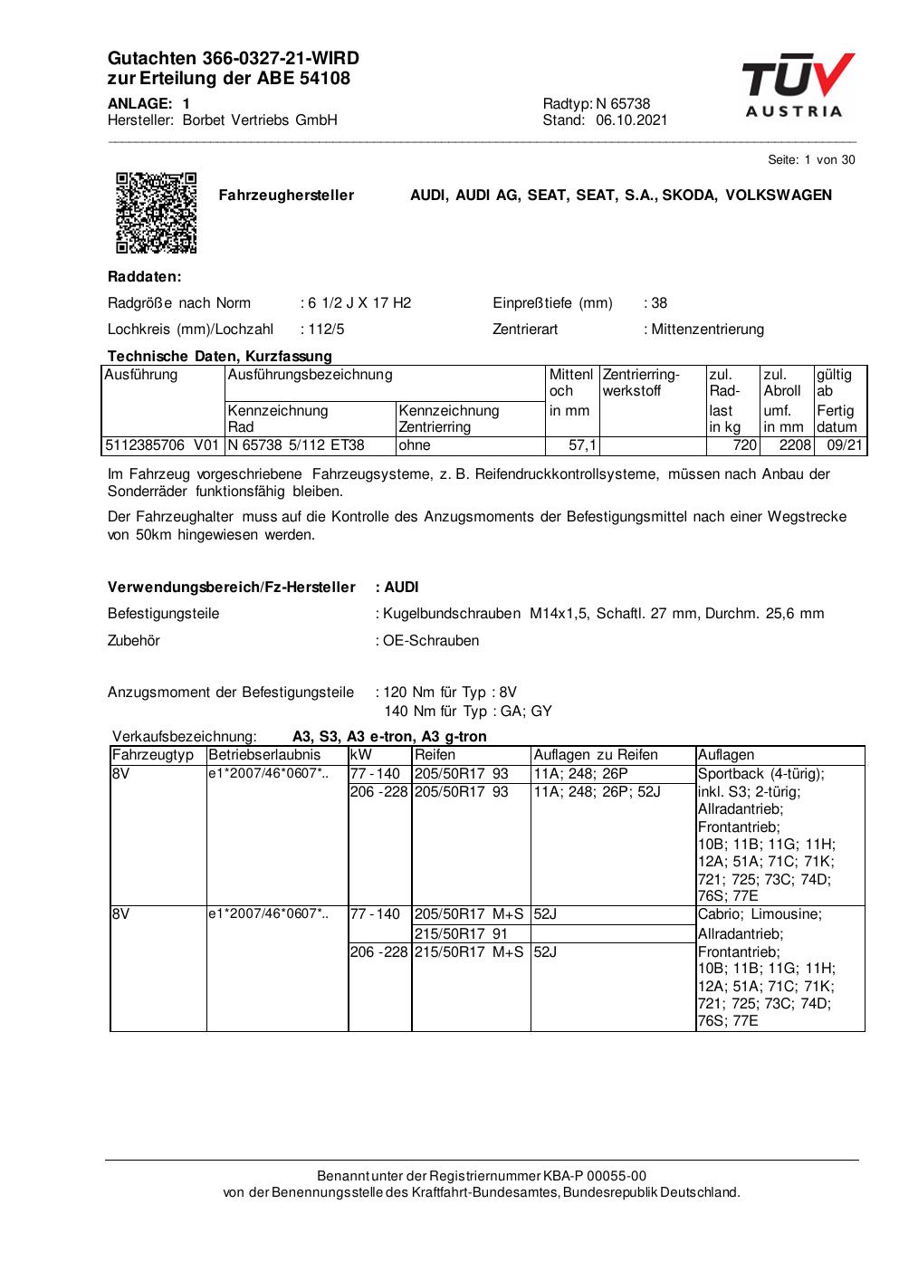 Dieses Gutachten (abe) bezieht sich auf die Alufelge Borbet N 65738 in der Ausführung 2Jx17 ET 0, Mittenloch 0 mm (KBA 54108). Im PDF findest du typischerweise zulässige Reifengrößen, Auflagen/Anbauhinweise und – je nach Dokument – Hinweise zur Eintragung.