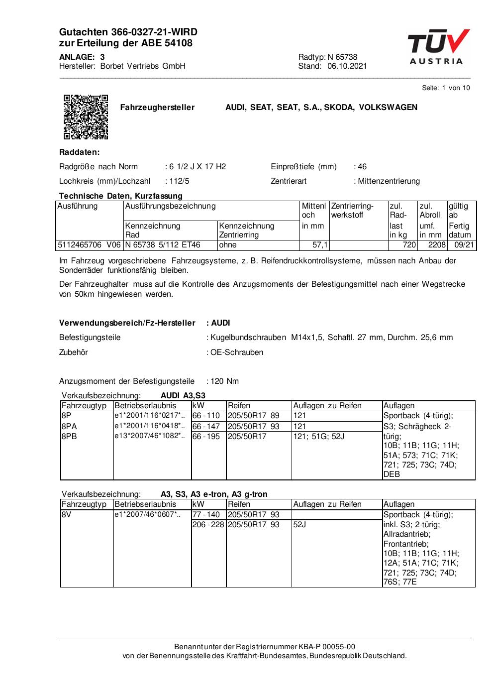 Felgengutachten / abe für Alufelgen Borbet N 65738 (2Jx17 ET 0, Mittenloch 0 mm) mit KBA 54108 (Zertifikatsnummer 54108). Hier kostenlos als PDF herunterladen. Der Download-Link ist 24 Stunden gültig und kann bis zu zwei Mal verwendet werden.