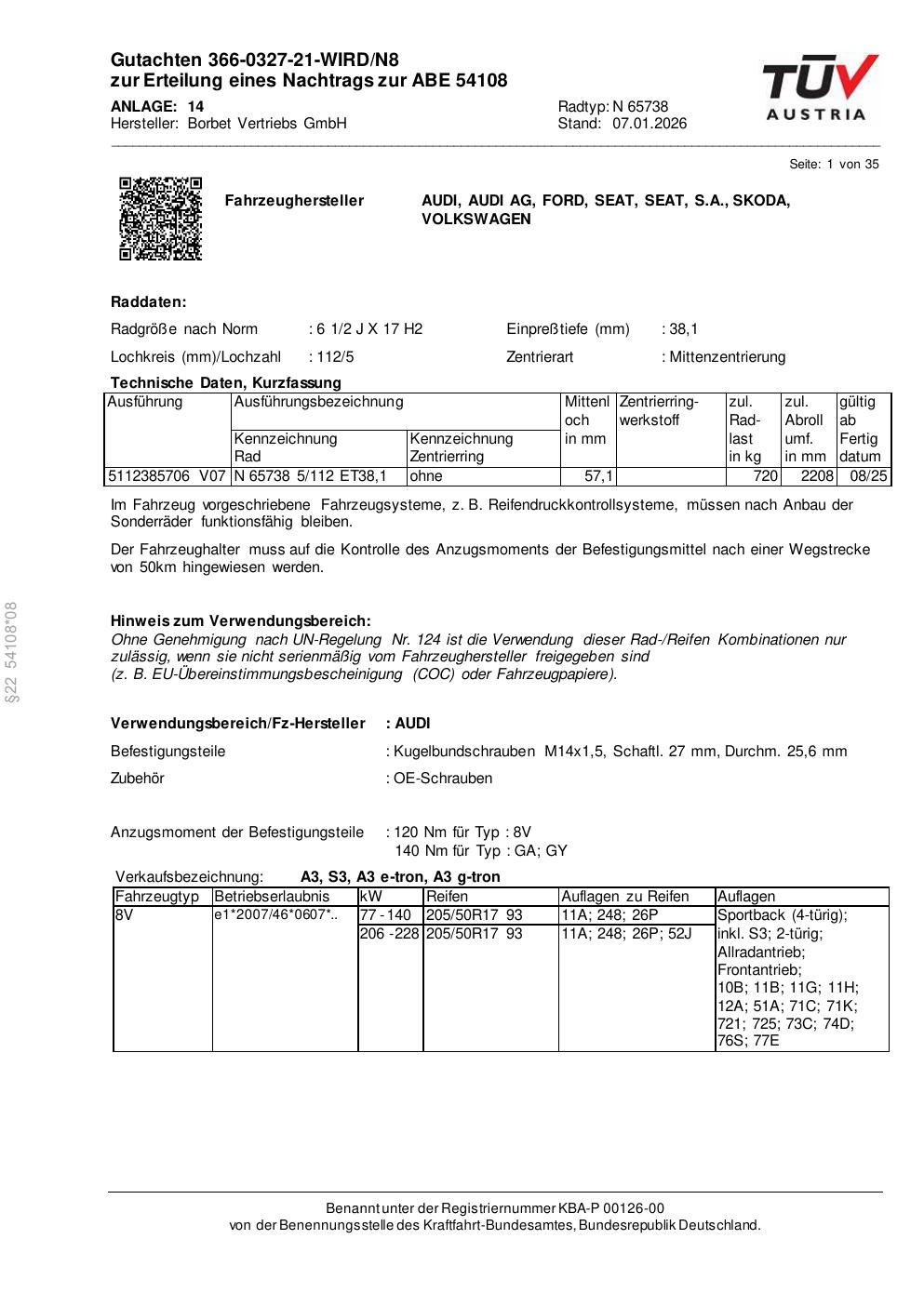 Dieses Gutachten (abe) bezieht sich auf die Alufelge Borbet N 65738 in der Ausführung 2Jx17 ET 0, Mittenloch 0 mm (KBA 54108). Im PDF findest du typischerweise zulässige Reifengrößen, Auflagen/Anbauhinweise und – je nach Dokument – Hinweise zur Eintragung.
