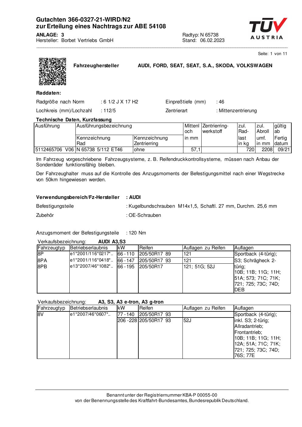 Dieses Gutachten (abe) bezieht sich auf die Alufelge Borbet N 65738 in der Ausführung 2Jx17 ET 0, Mittenloch 0 mm (KBA 54108). Im PDF findest du typischerweise zulässige Reifengrößen, Auflagen/Anbauhinweise und – je nach Dokument – Hinweise zur Eintragung.