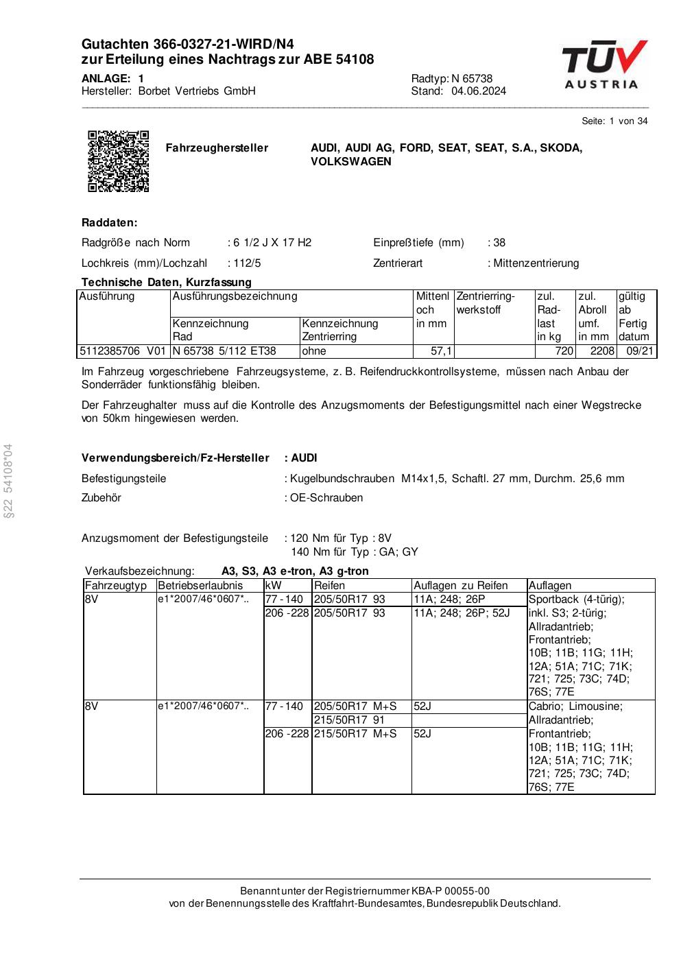 Dieses Gutachten (abe) bezieht sich auf die Alufelge Borbet N 65738 in der Ausführung 2Jx17 ET 0, Mittenloch 0 mm (KBA 54108). Im PDF findest du typischerweise zulässige Reifengrößen, Auflagen/Anbauhinweise und – je nach Dokument – Hinweise zur Eintragung.