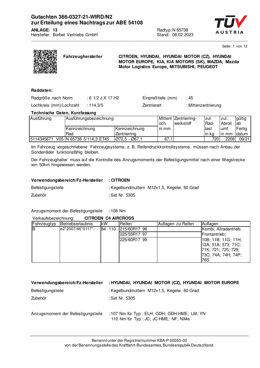 Dieses Gutachten (abe) bezieht sich auf die Alufelge Borbet N 65738 in der Ausführung 2Jx17 ET 0, Mittenloch 0 mm (KBA 54108). Im PDF findest du typischerweise zulässige Reifengrößen, Auflagen/Anbauhinweise und – je nach Dokument – Hinweise zur Eintragung.