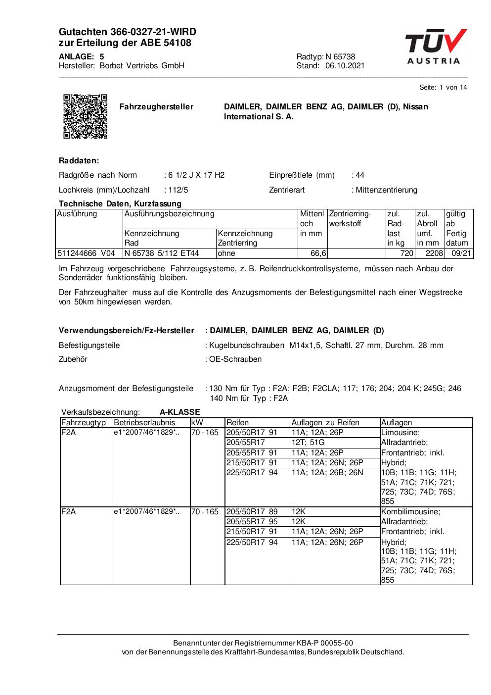 Felgengutachten / abe für Alufelgen Borbet N 65738 (2Jx17 ET 0, Mittenloch 0 mm) mit KBA 54108 (Zertifikatsnummer 54108). Hier kostenlos als PDF herunterladen. Der Download-Link ist 24 Stunden gültig und kann bis zu zwei Mal verwendet werden.