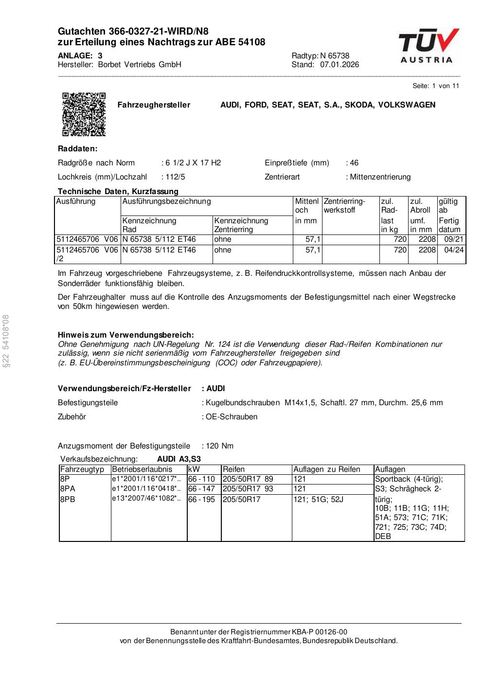 Dieses Gutachten (abe) bezieht sich auf die Alufelge Borbet N 65738 in der Ausführung 2Jx17 ET 0, Mittenloch 0 mm (KBA 54108). Im PDF findest du typischerweise zulässige Reifengrößen, Auflagen/Anbauhinweise und – je nach Dokument – Hinweise zur Eintragung.