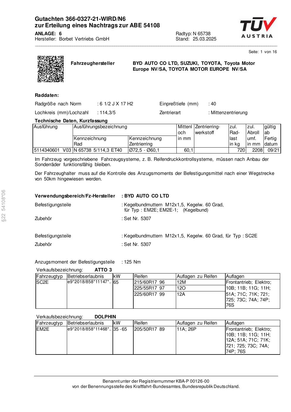 Dieses Gutachten (abe) bezieht sich auf die Alufelge Borbet N 65738 in der Ausführung 2Jx17 ET 0, Mittenloch 0 mm (KBA 54108). Im PDF findest du typischerweise zulässige Reifengrößen, Auflagen/Anbauhinweise und – je nach Dokument – Hinweise zur Eintragung.