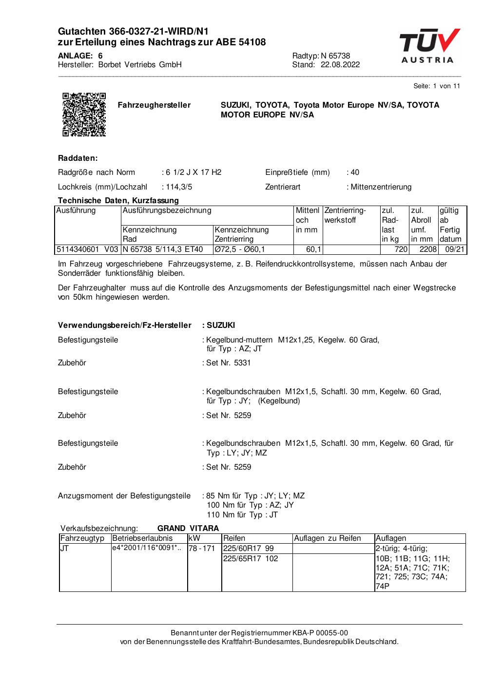 Dieses Gutachten (abe) bezieht sich auf die Alufelge Borbet N 65738 in der Ausführung 2Jx17 ET 0, Mittenloch 0 mm (KBA 54108). Im PDF findest du typischerweise zulässige Reifengrößen, Auflagen/Anbauhinweise und – je nach Dokument – Hinweise zur Eintragung.
