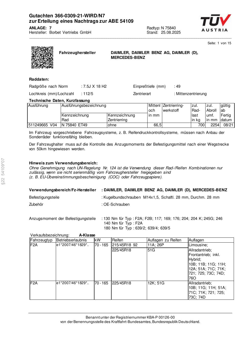 Dieses Gutachten (abe) bezieht sich auf die Alufelge Borbet N 75840 in der Ausführung 7.5Jx18 ET 0, Mittenloch 0 mm (KBA 54109). Im PDF findest du typischerweise zulässige Reifengrößen, Auflagen/Anbauhinweise und – je nach Dokument – Hinweise zur Eintragung.