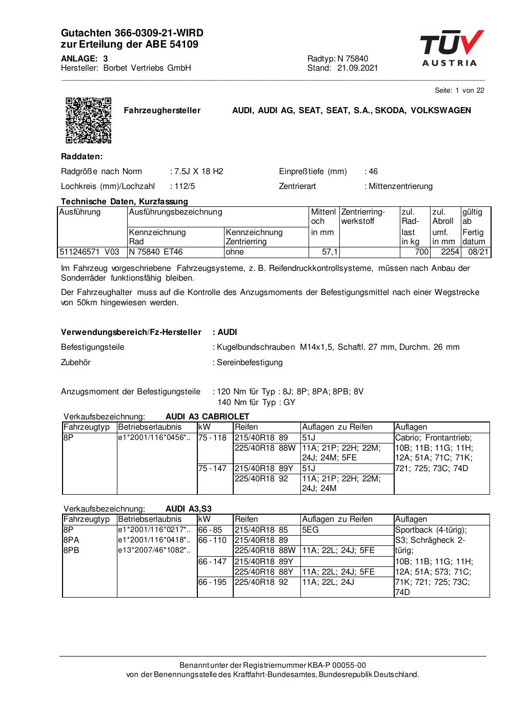 Dieses Gutachten (abe) bezieht sich auf die Alufelge Borbet N 75840 in der Ausführung 7.5Jx18 ET 0, Mittenloch 0 mm (KBA 54109). Im PDF findest du typischerweise zulässige Reifengrößen, Auflagen/Anbauhinweise und – je nach Dokument – Hinweise zur Eintragung.