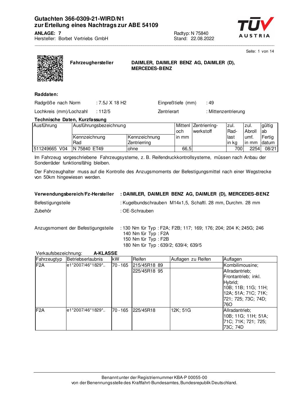 Dieses Gutachten (abe) bezieht sich auf die Alufelge Borbet N 75840 in der Ausführung 7.5Jx18 ET 0, Mittenloch 0 mm (KBA 54109). Im PDF findest du typischerweise zulässige Reifengrößen, Auflagen/Anbauhinweise und – je nach Dokument – Hinweise zur Eintragung.