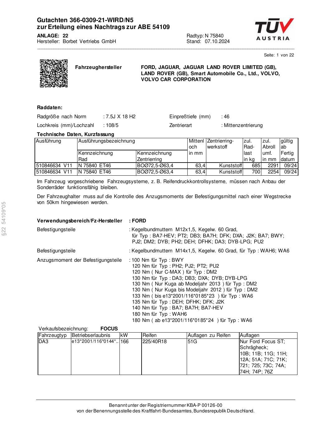 Dieses Gutachten (abe) bezieht sich auf die Alufelge Borbet N 75840 in der Ausführung 7.5Jx18 ET 0, Mittenloch 0 mm (KBA 54109). Im PDF findest du typischerweise zulässige Reifengrößen, Auflagen/Anbauhinweise und – je nach Dokument – Hinweise zur Eintragung.
