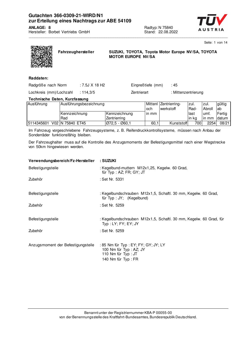 Dieses Gutachten (abe) bezieht sich auf die Alufelge Borbet N 75840 in der Ausführung 7.5Jx18 ET 0, Mittenloch 0 mm (KBA 54109). Im PDF findest du typischerweise zulässige Reifengrößen, Auflagen/Anbauhinweise und – je nach Dokument – Hinweise zur Eintragung.