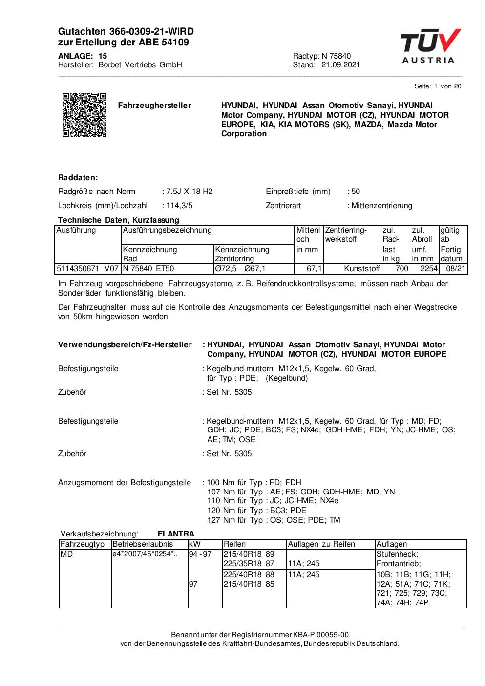 Dieses Gutachten (abe) bezieht sich auf die Alufelge Borbet N 75840 in der Ausführung 7.5Jx18 ET 0, Mittenloch 0 mm (KBA 54109). Im PDF findest du typischerweise zulässige Reifengrößen, Auflagen/Anbauhinweise und – je nach Dokument – Hinweise zur Eintragung.
