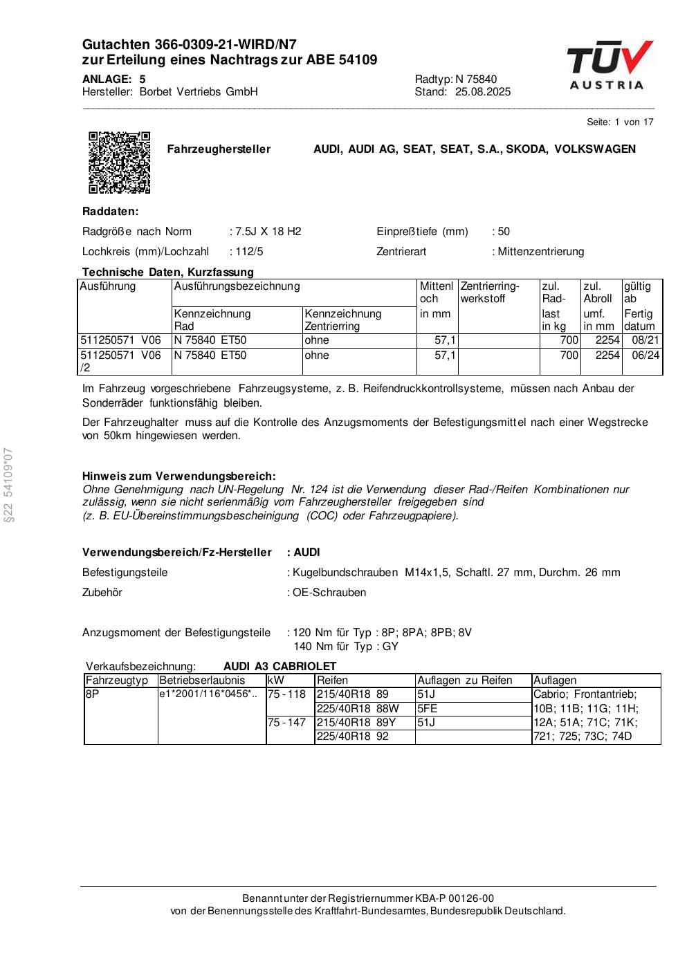 Dieses Gutachten (abe) bezieht sich auf die Alufelge Borbet N 75840 in der Ausführung 7.5Jx18 ET 0, Mittenloch 0 mm (KBA 54109). Im PDF findest du typischerweise zulässige Reifengrößen, Auflagen/Anbauhinweise und – je nach Dokument – Hinweise zur Eintragung.