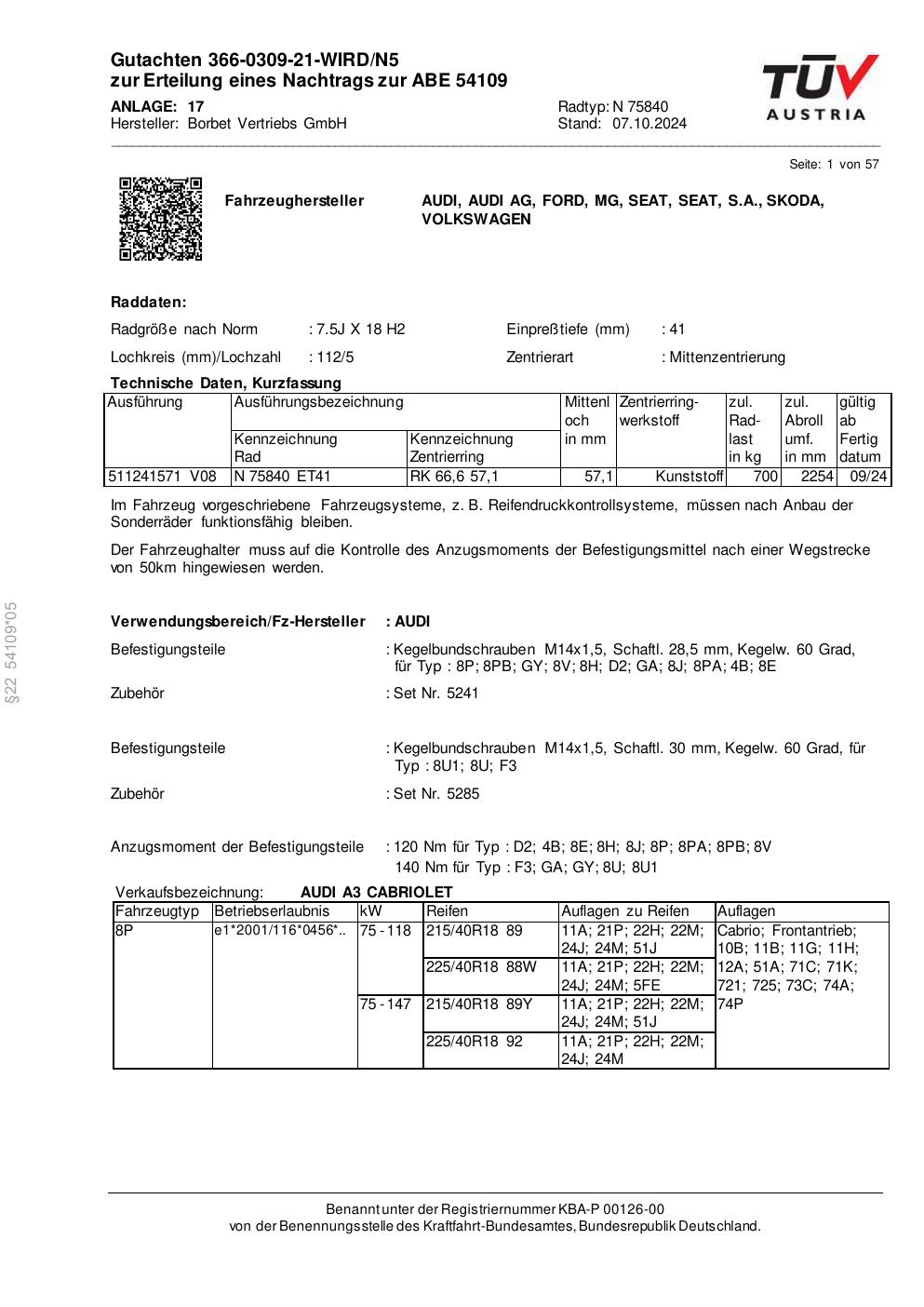 Dieses Gutachten (abe) bezieht sich auf die Alufelge Borbet N 75840 in der Ausführung 7.5Jx18 ET 0, Mittenloch 0 mm (KBA 54109). Im PDF findest du typischerweise zulässige Reifengrößen, Auflagen/Anbauhinweise und – je nach Dokument – Hinweise zur Eintragung.