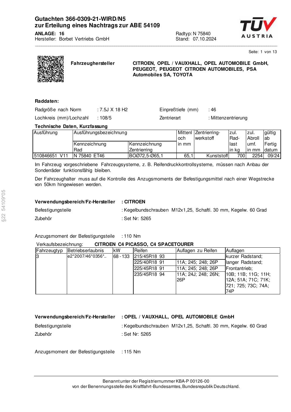 Dieses Gutachten (abe) bezieht sich auf die Alufelge Borbet N 75840 in der Ausführung 7.5Jx18 ET 0, Mittenloch 0 mm (KBA 54109). Im PDF findest du typischerweise zulässige Reifengrößen, Auflagen/Anbauhinweise und – je nach Dokument – Hinweise zur Eintragung.