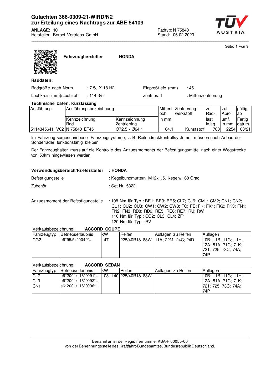 Dieses Gutachten (abe) bezieht sich auf die Alufelge Borbet N 75840 in der Ausführung 7.5Jx18 ET 0, Mittenloch 0 mm (KBA 54109). Im PDF findest du typischerweise zulässige Reifengrößen, Auflagen/Anbauhinweise und – je nach Dokument – Hinweise zur Eintragung.